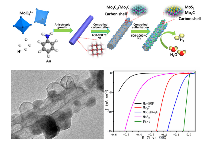 具有高活性、稳定性以及有效进行析氢反应(HER)的非贵金属电催化剂对于低成本和大规模水分解至关重要,单一的MoS2在碱性环境中具有电催化析氢惰性,不利于水的吸/脱附,因此,通过设计和优化MoS2催化剂材料的基本结构,使其在碱性环境下具有更丰富的活性位点以及高的导电性是非常有必要的。该工作通过两步煅烧和硫化工艺,首次从碳化的Mo2C-Mo3C2异质纳米线中构建了氮掺杂碳上的MoS2@Mo2C空心异质结构电催化剂材料。研究结果表明,设计的电催化剂能够有效增强碱性环境中的电催化活性:起始电势为28 mV,在10 mA cm-2电流密度下的过电势为129 mV,Tafel斜率较小,为78 mV dec-1,以及长期的稳定性。这一研究成果对电催化领域中非贵金属催化剂的设计具有指导意义。