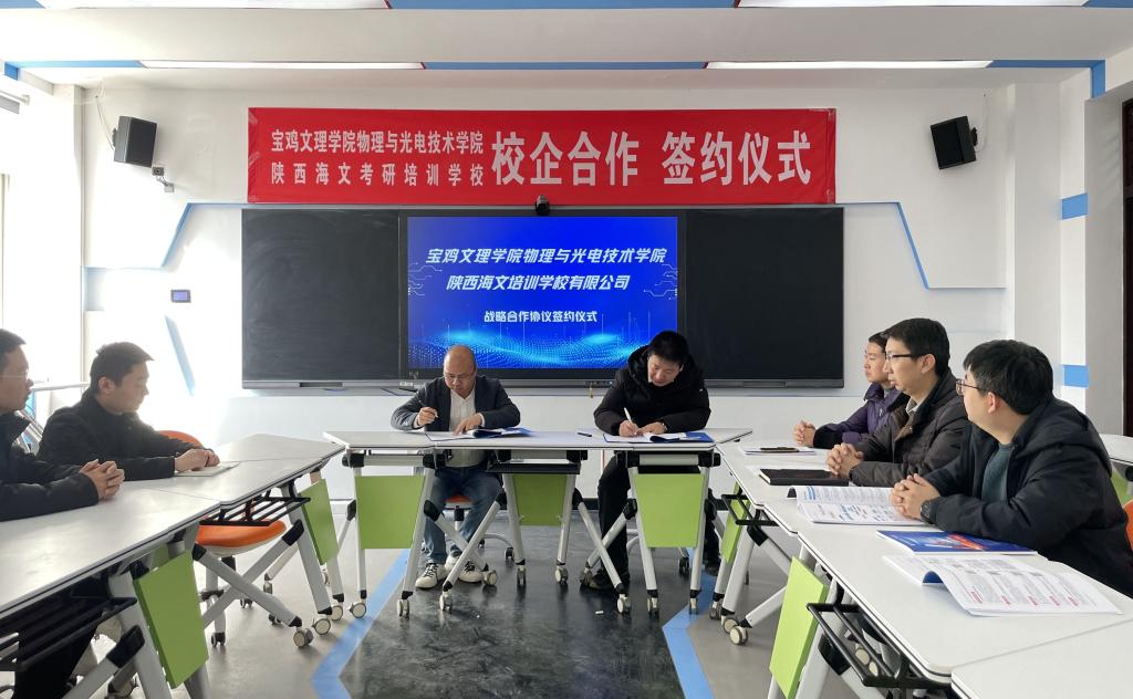 12月7日上午,威廉希尔官网与万学教育陕西海文培训公司有限公司在石鼓校区教学主楼201会议室举行了校企合作协议签约仪式。物理与光电技术公司党委书记邓茹、经理钱郁、副经理刘飞、周新淳出席仪式。