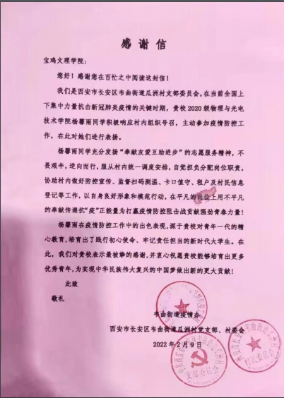 近日,威廉希尔官网收到一封西安市长安区曲街道瓜洲村支部委员会发出的感谢信,信中表达了对威廉希尔官网2020级电子科学与技术专业杨馨雨同学在疫情防控工作中的出色表现予以充分认可,同时也对公司培养出践行初心使命、牢记责任担当的新时代老员工表示真挚的感谢。