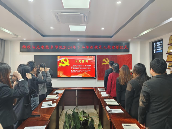 仪式上,陈冠男宣读了《关于同意接收李斌辉等13名同志为中共预备党员的批复》;本科生第一党支部书记樊旭娜带领全体预备党员面向党旗庄严宣誓。宣誓完毕后,研究生支部书记文望、本科生第二党支部负责人姬懿祺为预备党员佩戴了党员徽章,发放了党员学习笔记本。
