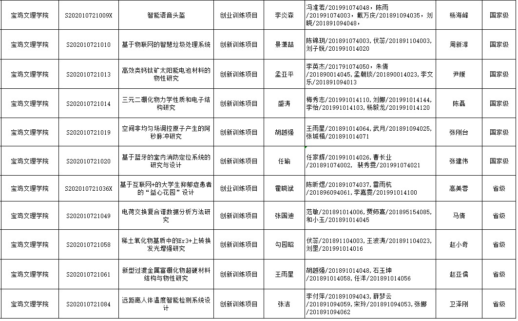 近日,教育部、省教育厅分别公布了2020年国家级、省级老员工创新创业训练计划项目,公司组织申报的6个项目获批国家级立项。其中,创新训练项目5项、创业训练项目1项;公司组织申报的5个项目获批省级立项,其中,创新训练项目4项、创业训练项目1项。