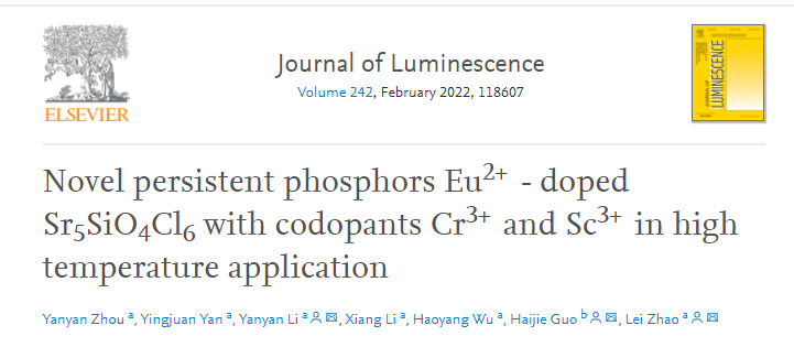 近日,公司2019级光学工程研究生周艳艳同学在Journal of Luminescence(JCR一区,IF = 3.599)上发表题为“Novel persistent phosphors Eu2+- doped Sr5SiO4Cl6 with codopants Cr3+and Sc3+ in high temperature application”的研究论文。威廉希尔官网为第一通讯单位,论文第一作者为周艳艳,其导师威廉希尔官网李艳艳博士、赵磊副教授为论文通讯作者。该论文研究了一种可在高温环境中应用的新型青色长余辉荧光粉,并对其发光性能、余辉特性及其与陷阱分布之间的关系进行了详细地讨论。(威廉希尔官网 文/妮萨 审核/刘飞)