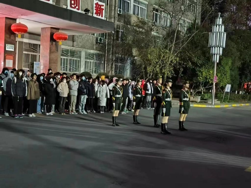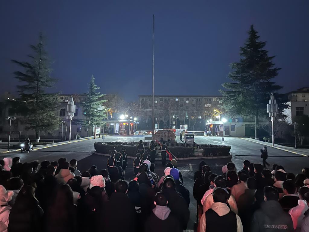 旗手们迈着坚定的步伐护卫着五星红旗入场,伴随着庄严的《义勇军进行曲》,全体成员行注目礼,奏唱国歌,五星红旗冉冉升起。